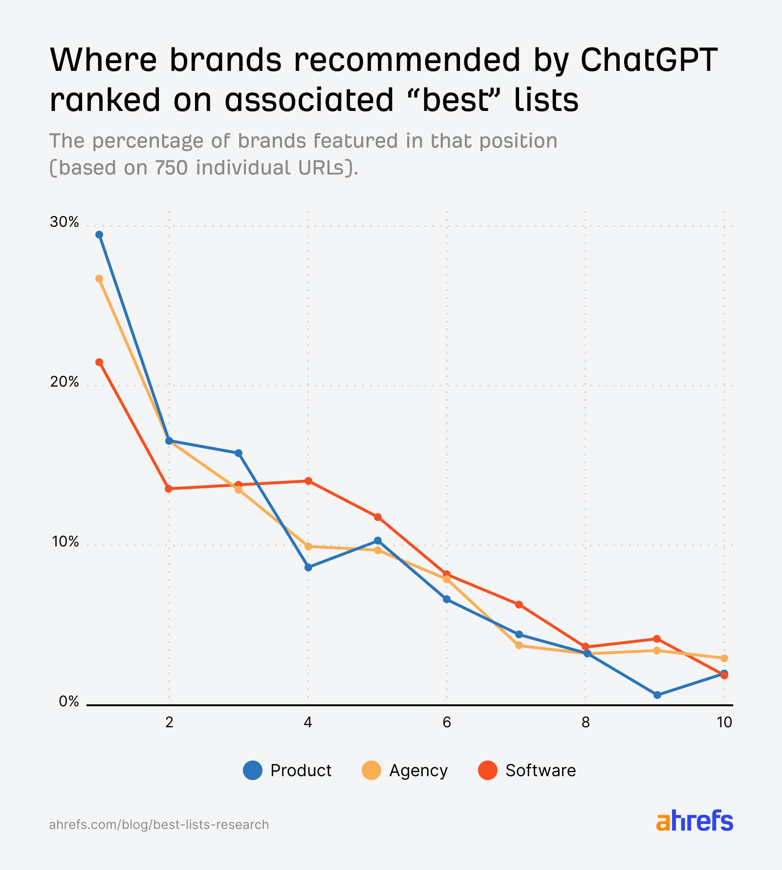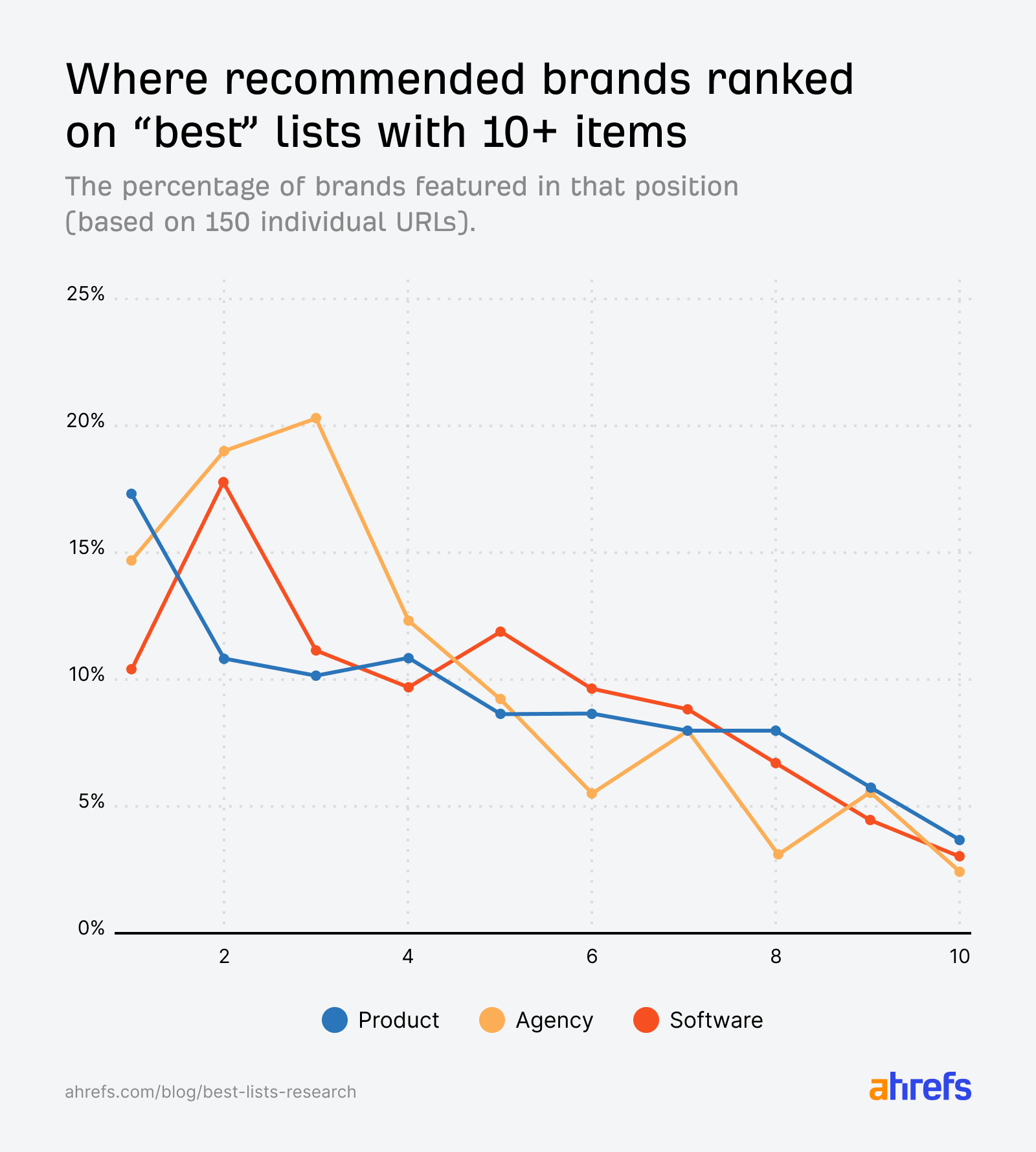 Taking all 750 lists into account, here’s the distribution of where a mentioned product, brand, or service provider was featured in an associated “best” list.