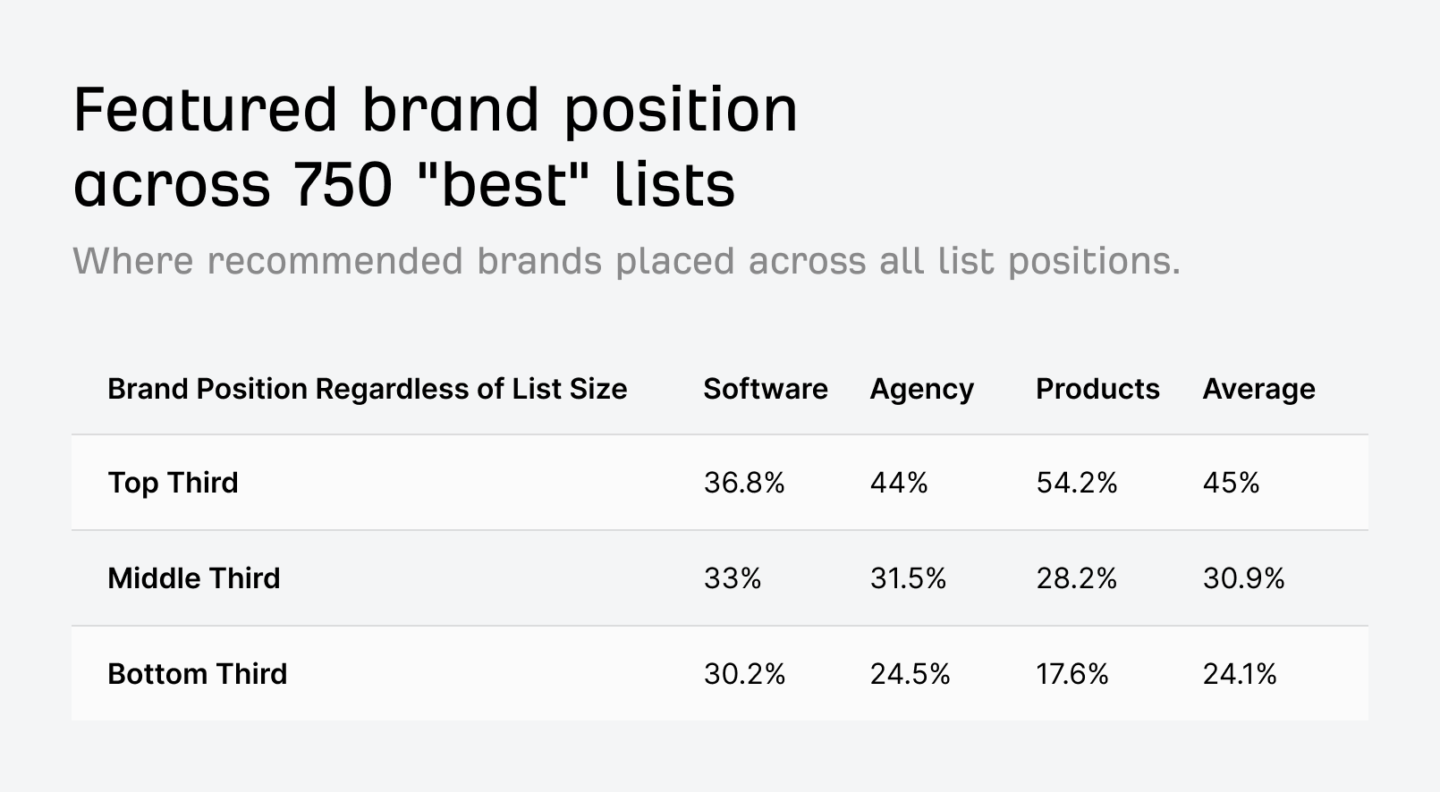 For each of the categories in question, we took 250 “best” blog lists from ChatGPT’s responses (750 in total) to determine where a specific brand was featured when that list was sourced alongside it.