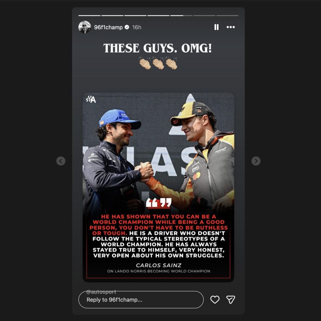 The 1996 F1 world champion reshared this quote from Sainz via his Instagram story on Sunday, lauding the pair’s relationship.