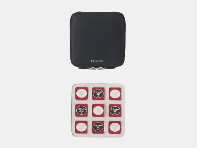 Forget playing Tic-Tac-Toe on a piece of scrap paper: Prada just elevated the elementary school game to elegant heights with its travel-friendly, leather-accented set. Composed of a black Saffiano leather case that unzips to reveal a metal and red leather-lined game board and coordinating Prada-branded playing pieces, the game is small enough to fit in a