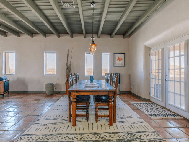 Named after a mountain just opposite Rio Bravo Ranch, La Centinela is elegant, with a tasteful desert-inspired interior design theme. Arched adobe windows showcase spectacular Rio Grande views, hand-carved wood accents adorn the indoor space, and an open-plan living and dining room encourages groups to congregate when their day of hiking is done. Considering that this listing’s porch alone is the size of a two-bedroom apartment (at 1,000 square feet), it’s a worthwhile stay for sunset seekers, too.