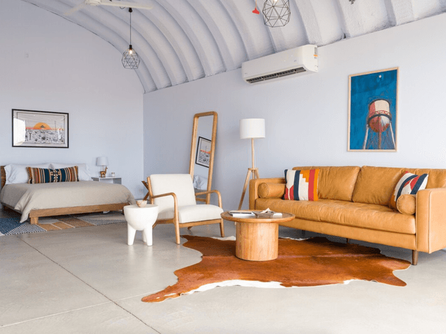 What if a vaulted shipping container and a midcentury-modern furniture store had a baby? The result might be something like Desert Sky Hut, a large, open-plan studio that’s equal parts trendy Williamsburg loft and industrial desert bunker. Filled with natural light, original artwork, and Southwestern textiles, this low-key dwelling has basic amenities like a kitchenette and full bathroom, so that you can hang out comfortably even in remote, wild West Texas.