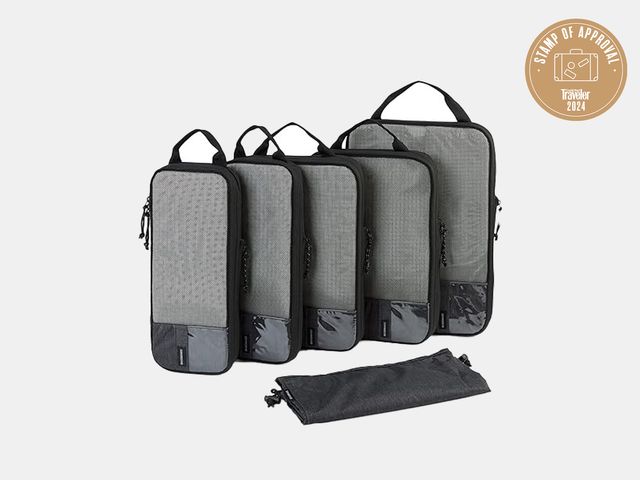 “If you’re looking for a simple set of no-frills packing cubes to help you stay organized, Calpak has you covered. This five-item set includes large cubes for bulky items, medium cubes for shirts and undergarments, and one water-resistant envelope pouch for dirty clothes or wet bathing suits. These are your classic packing cubes—they’re not compressive, but they’re lightweight, lay completely flat when empty, and do the trick at keeping your suitcase sorted. There’s a small window where you can add your own label to help identify the right packing cube, too. I’ve traveled with these a ton over the last few years and still reach for them often.” —M.K.