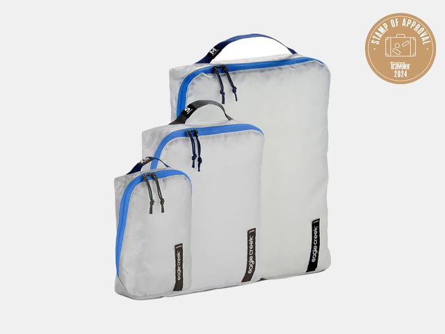 If you’re headed somewhere warm and plan to pack lightweight clothes, say a long weekend in Montauk or an island getaway, these Eagle Creek packing cubes are a solid, no-frills choice. This set comes with three pouches, sized extra small, small, and medium. These are another go-to for Flager, who says they’re best used for lightweight clothes you can roll up or fold flat, like athletic clothes and T-shirts. “I find the extra small size is well-suited for underwear (about a week’s worth, more than I thought could fit on first glance) or socks (around five ankle or no-shows, or two pairs of thicker socks). The small is good for T-shirts (three to five), and the biggest size, the medium, can accommodate one or two pairs of pants or two to three lighter sweaters,” Flager says. She admits she’ll gravitate toward larger packing cubes like the Paravel set for extended trips, but will pull these out for weekend trips and overnights.
