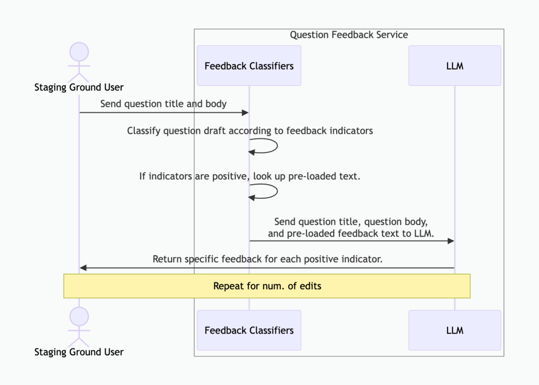 Last year we released Staging Ground to help new question-askers get feedback on their drafts from experienced users in a dedicated space before their question is posted publicly on Stack Overflow. We’ve since seen measurable improvements in the quality of questions posted; however, it still takes time for a question to get human feedback and make it through the full Staging Ground process.