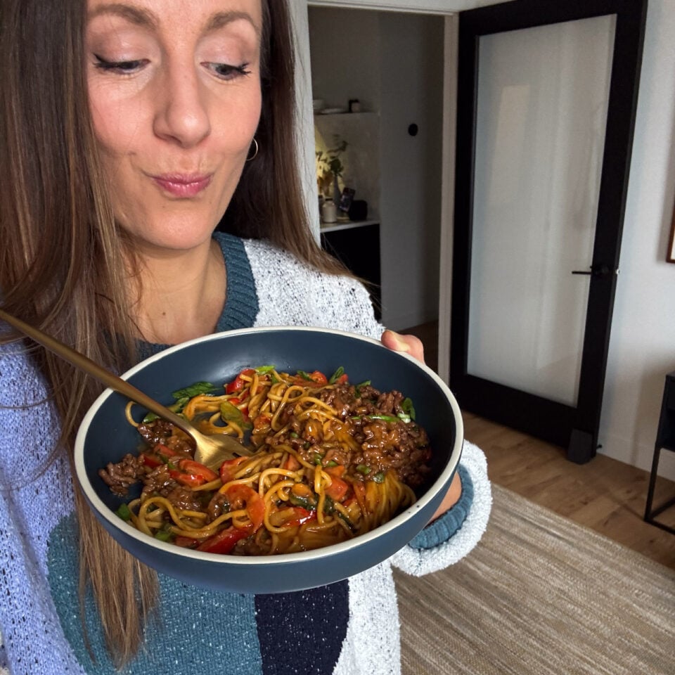 Caramelized ground beef atop a tangle of creamy peanut noodles and veggies! The best weeknight dinner!