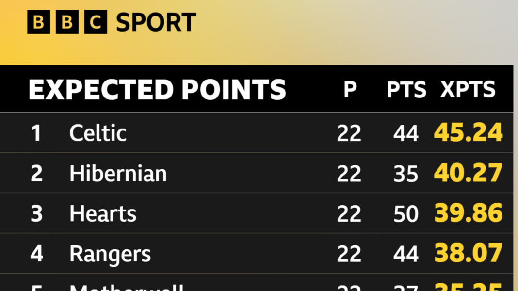 Opta’s model reckons Hearts are overperforming their expected points by a whopping 10, with Rangers’ overperformance at almost six.