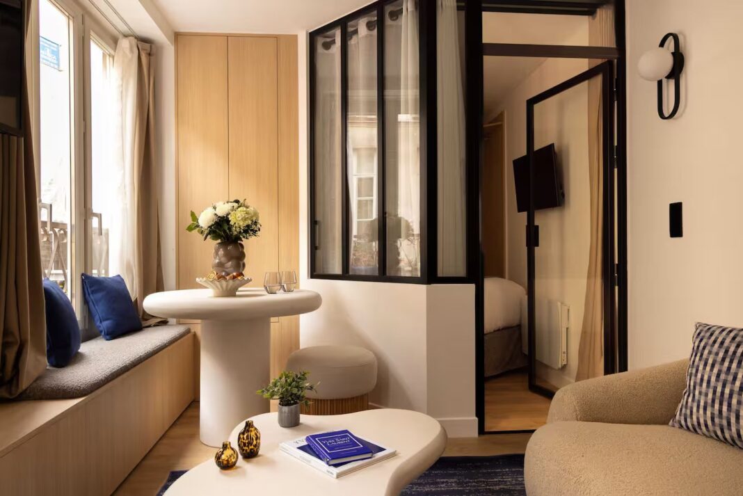 At just under 270 square feet, this Airbnb is a little more, let’s say, svelte, but it’s a perfect size for a solo traveler or a couple who don’t fight when they travel. (If you do get into a tiff, worry not—the separate sound-insulated bedroom can offer you both the opportunity for a time-out.) The space was refurbished recently in 2025, and the vibe is understated and modern, with light wood paneling, sleek black finishes, and stylish touches like bedside reading sconces and furniture in organic shapes. The kitchen comes with a refrigerator, washing machine, toaster, kettle, and coffee machine, as well as pots, pans, and cutlery. There’s just one flight of stairs to climb to reach the front door. And luckily, you’ll cool off easily enough with the central air conditioning. The neighborhood is stellar as well, located right on the iconic Rue des Rosiers (a pedestrian-only street) in Le Marais.