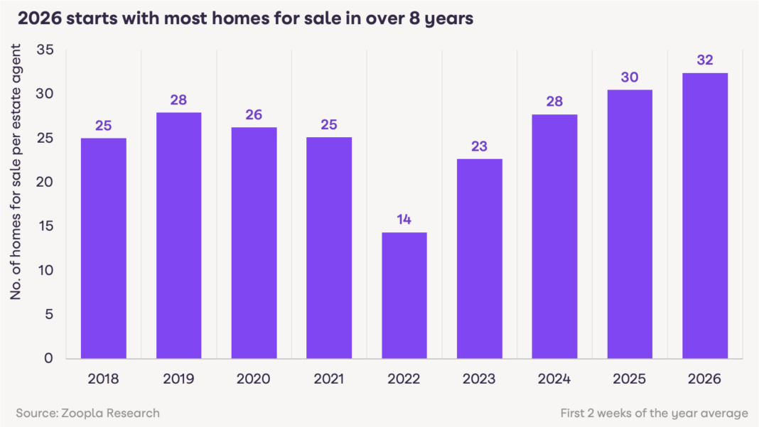 Estate agents listed an average of 32 homes for sale on its website over the first two weeks of this year, Zoopla said, up from 30 in 2025 and 28 in 2024 over the same time period.
